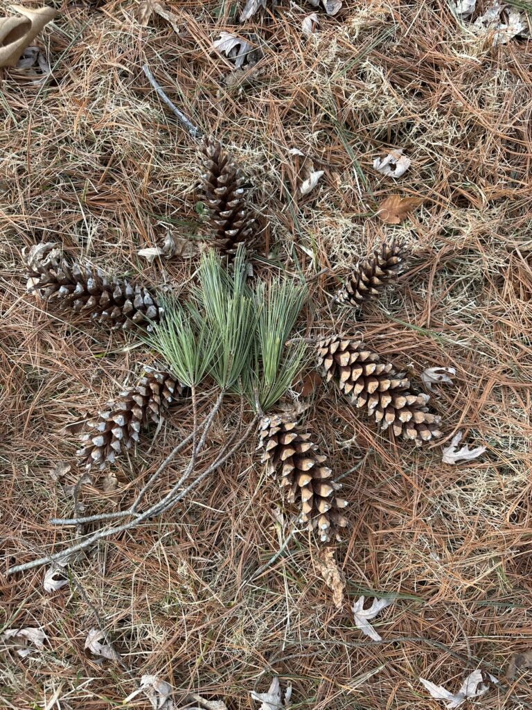 It’s four pine cones, back ends together and each tip pointing to one of the four directions. I laid the cones on the grass and moved fallen pine needles out from under them, forming a circle around them. At one point, I’d placed a pile of leaves at the center, but time and the elements have taken some creative license and modified it a bit.